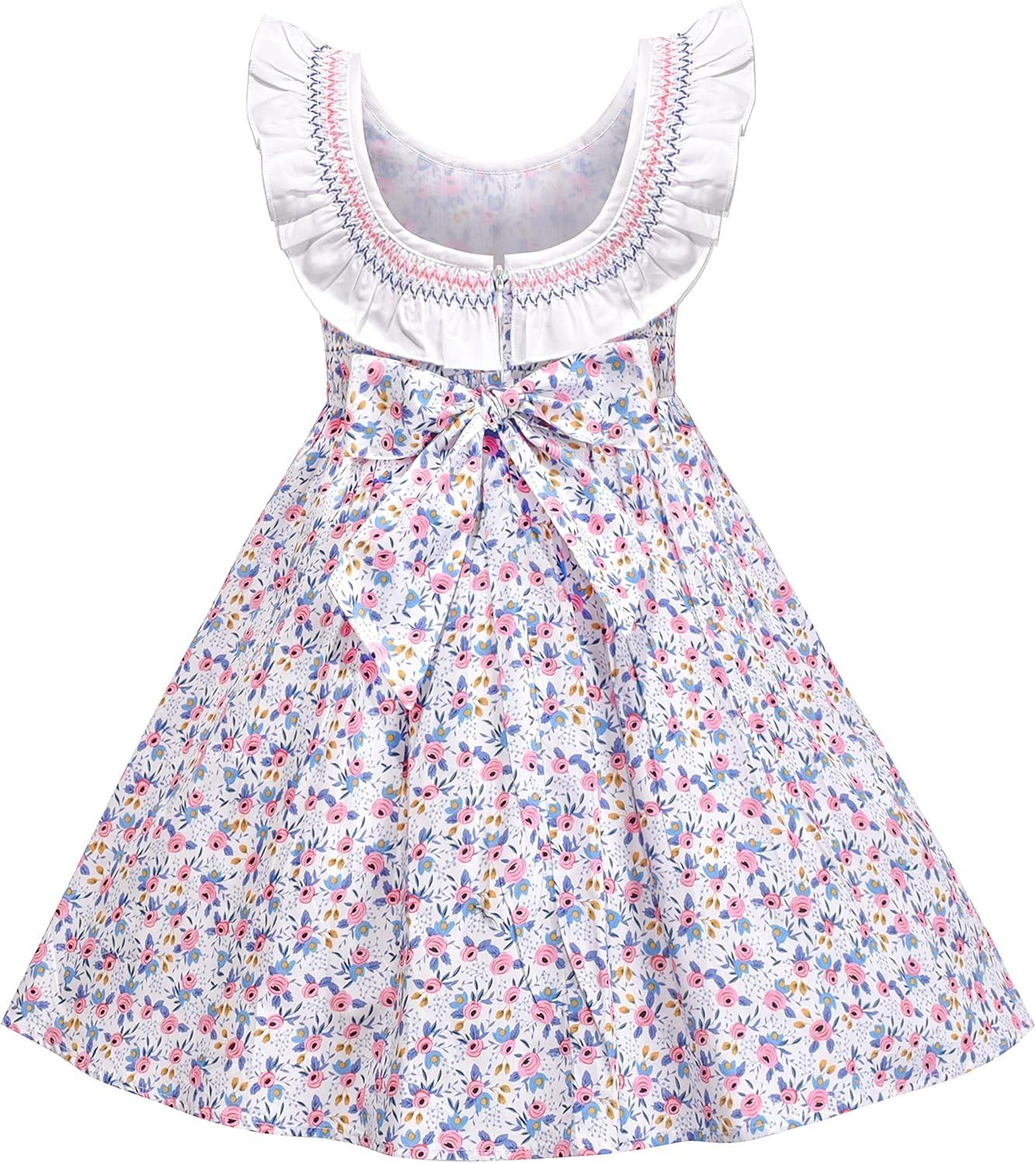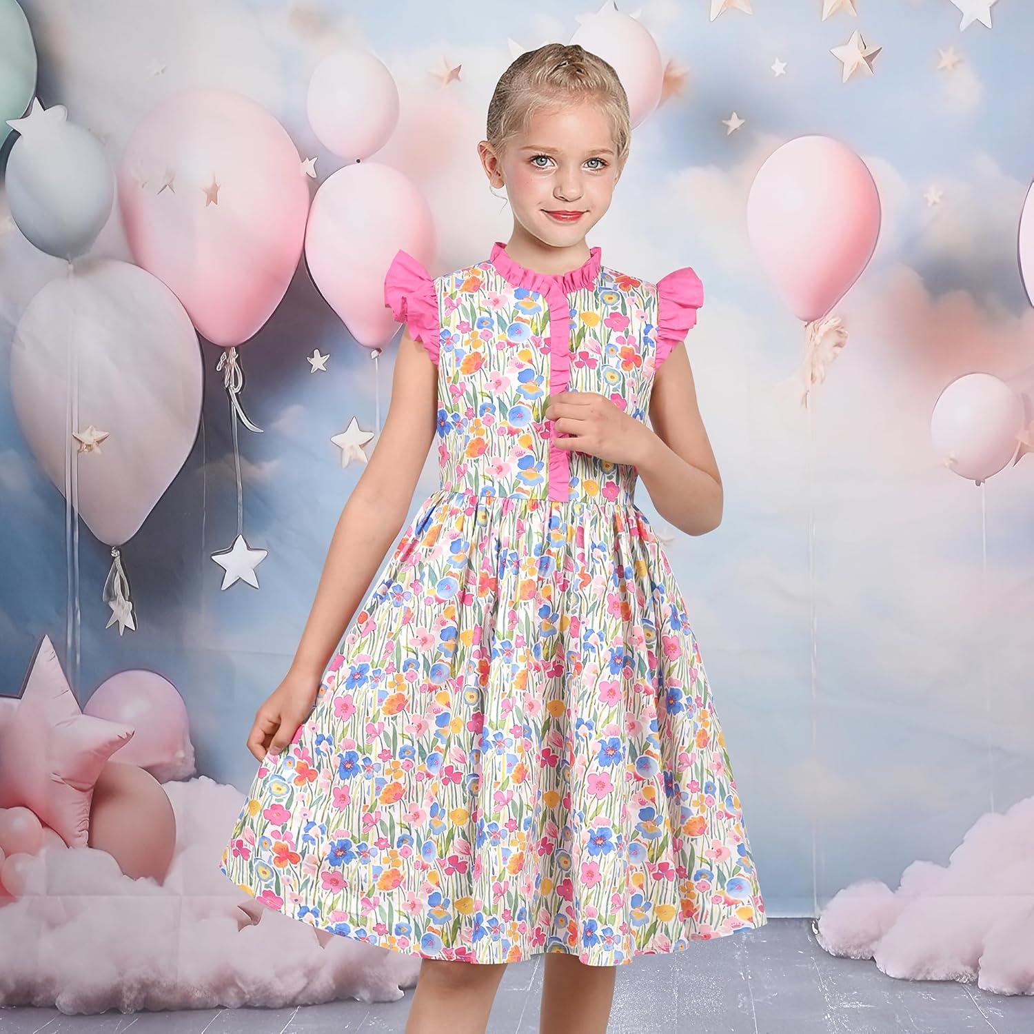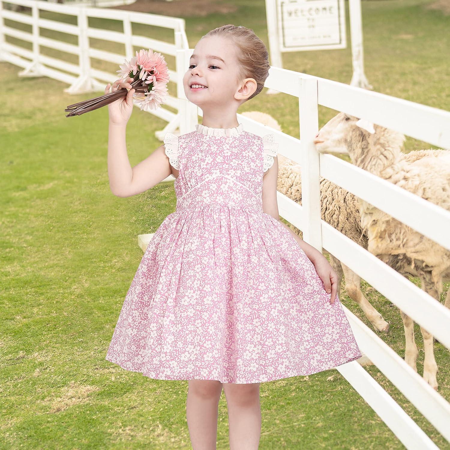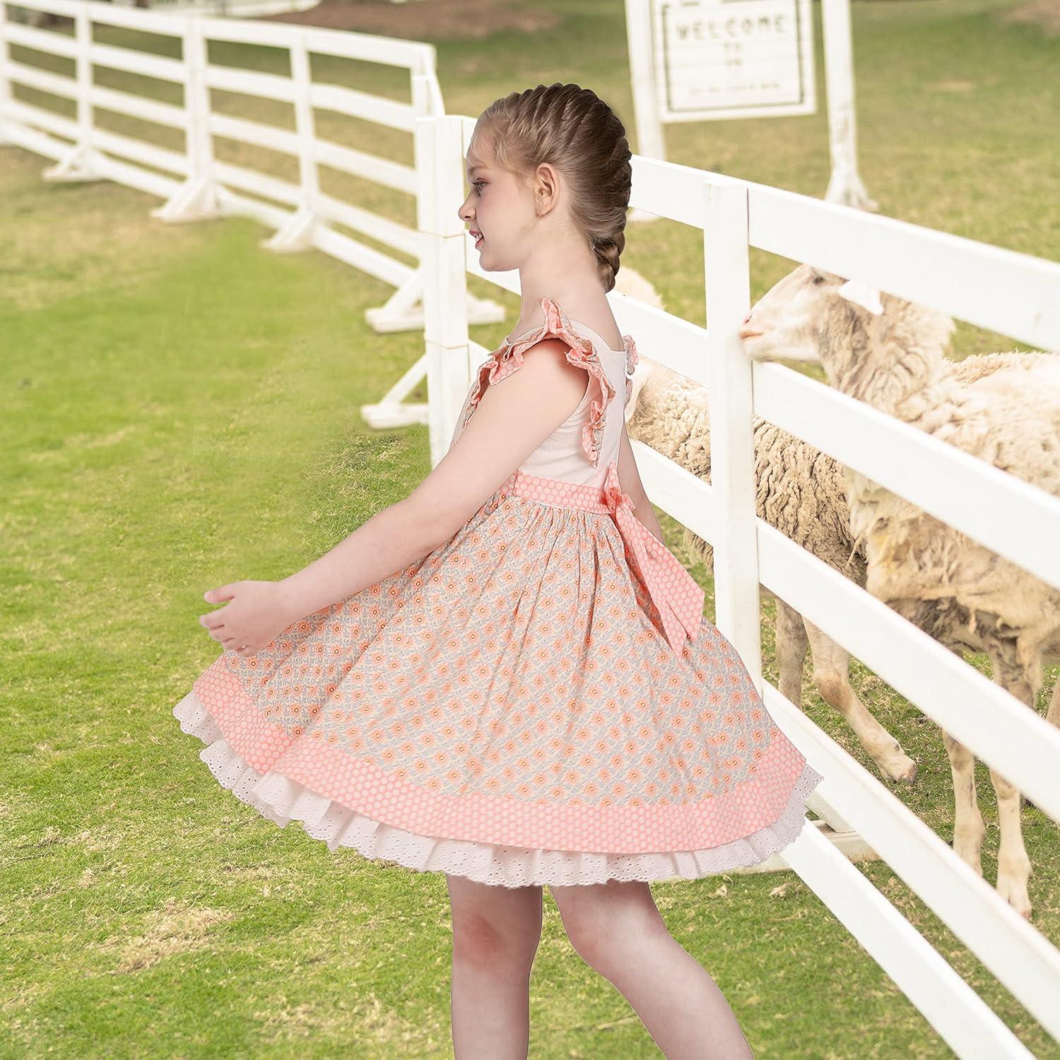 - Sunny Fashion Girls Dress Cotton Flower Square Collar A Line Ruffle Flare(Pink Beige Flower)