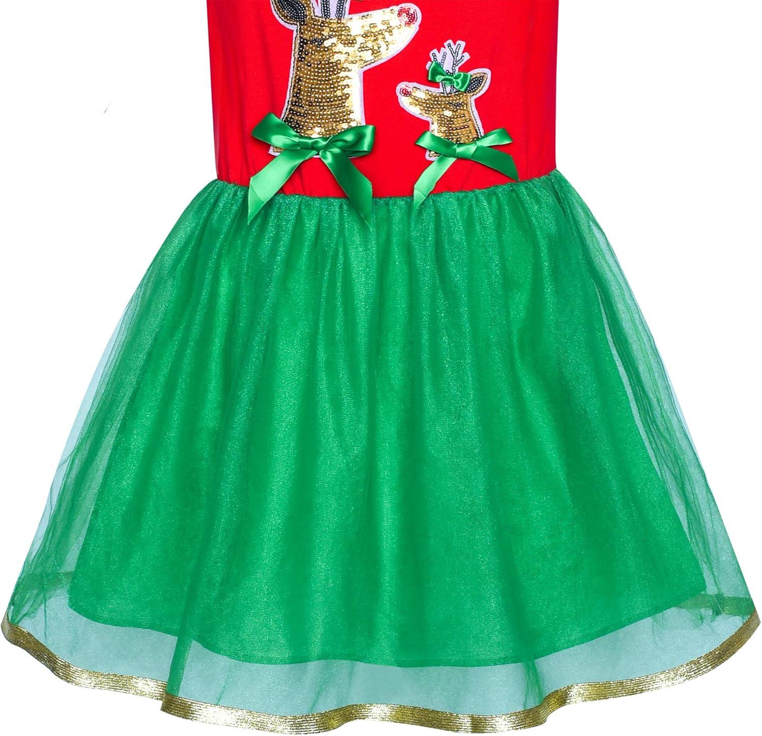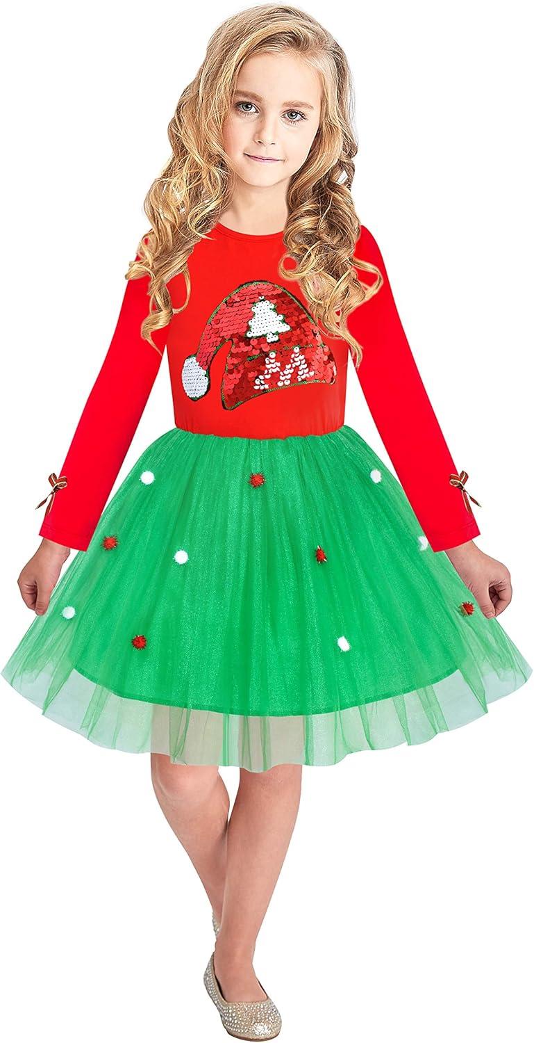 - Sunny Fashion Girls Dress Christmas Santa Hat Long Sleeve Party Dress Size 6-12(Red Green Reindeer)