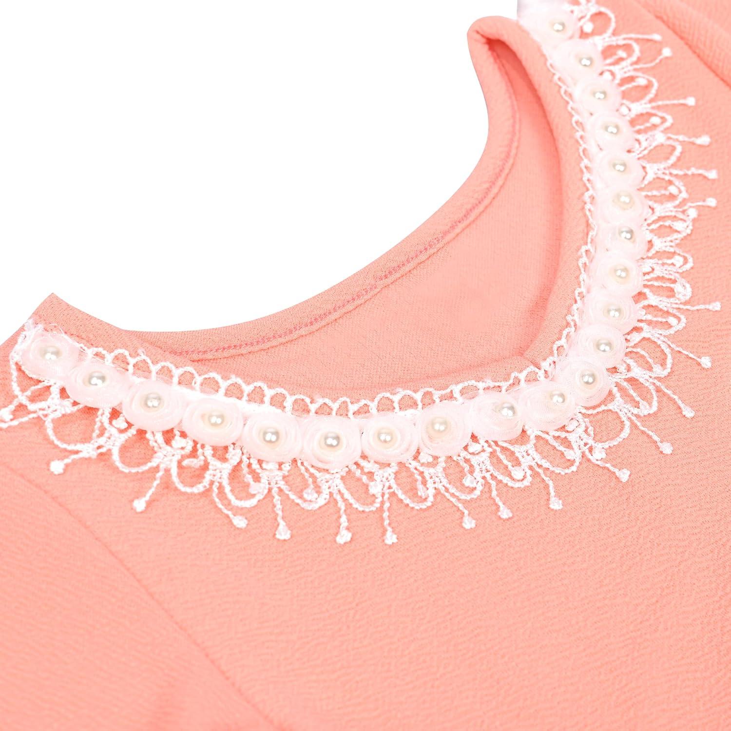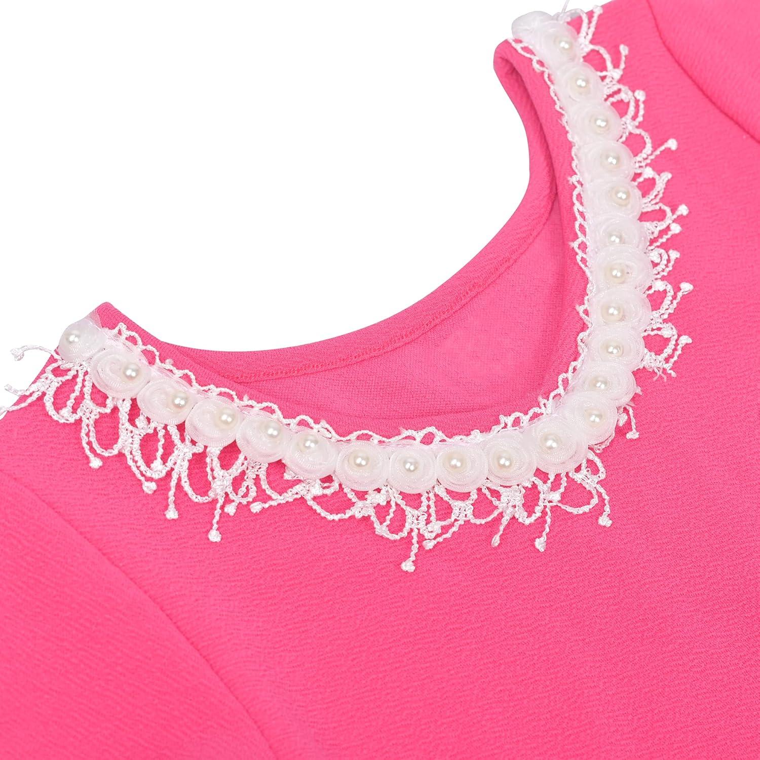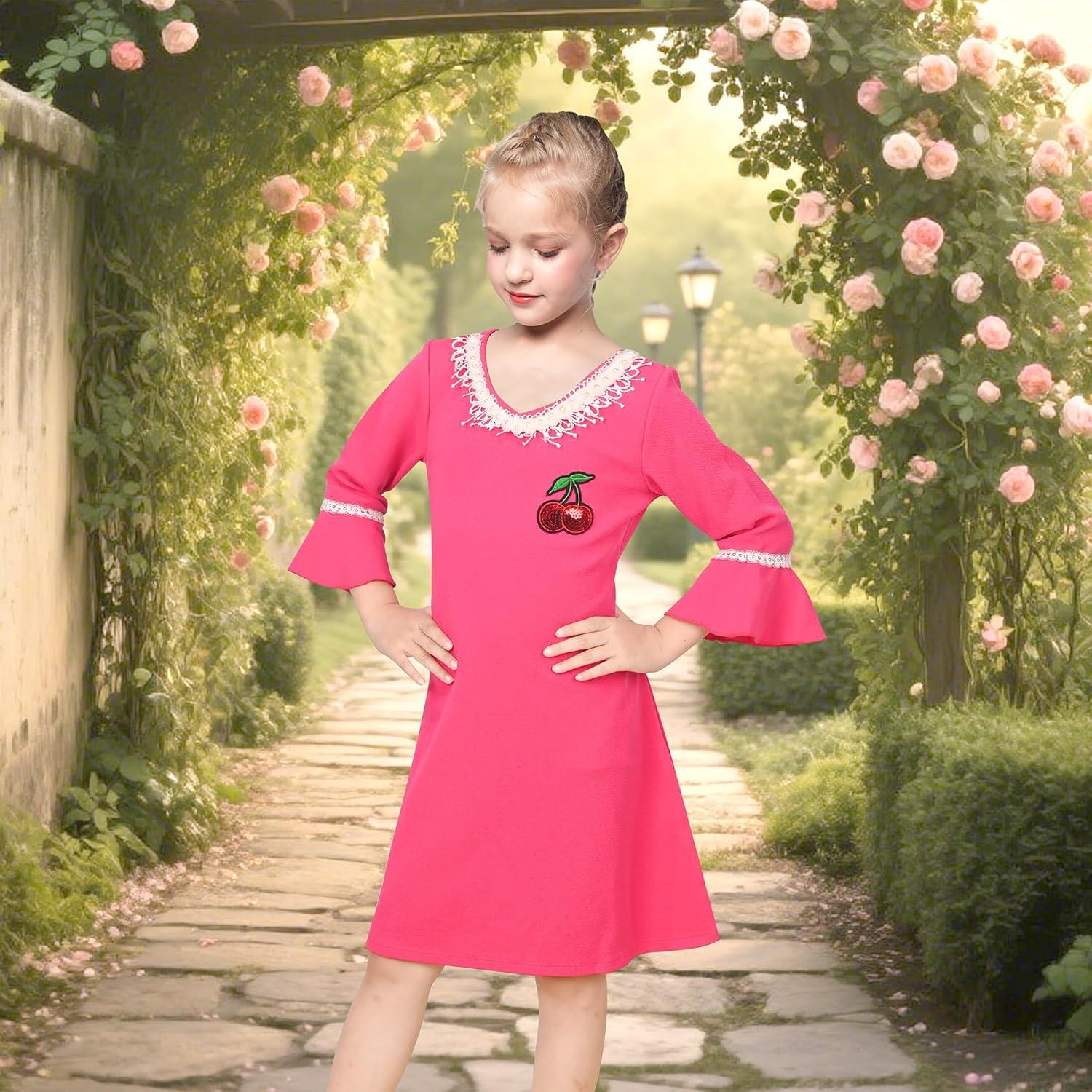 Sunny Fashion Girls Dress Lace Trim Bell Sleeve Cherry Applique Pearl A-Line Casual Size 3-8(Bright Pink)