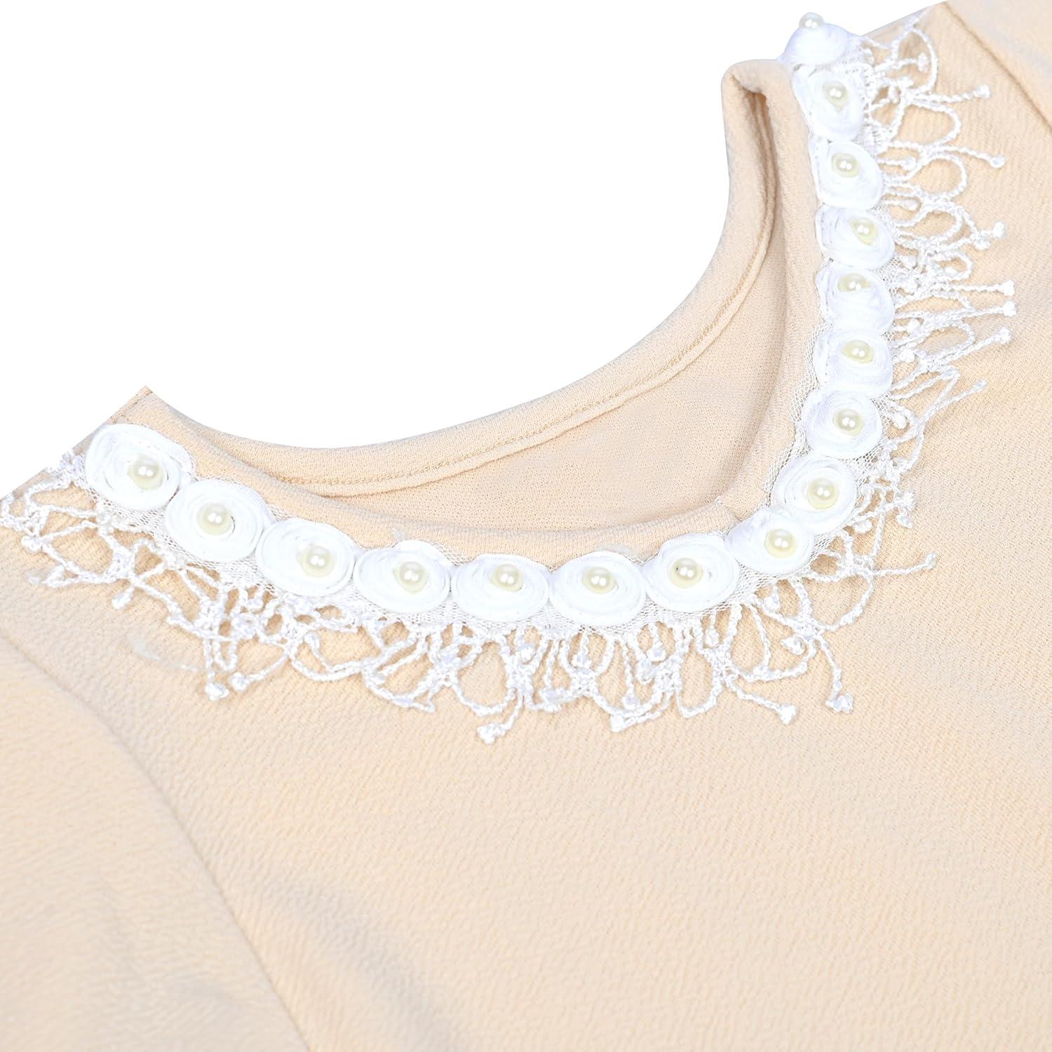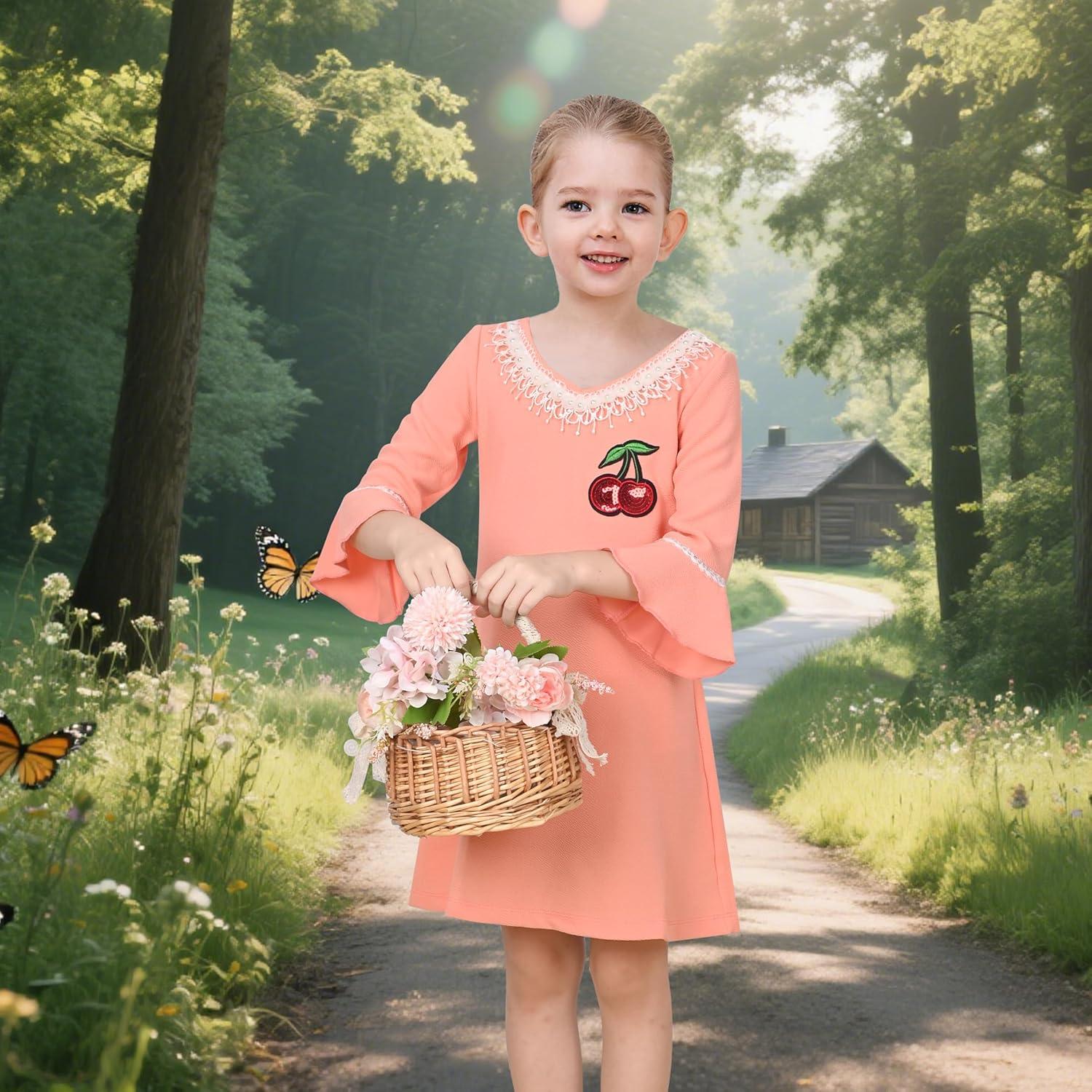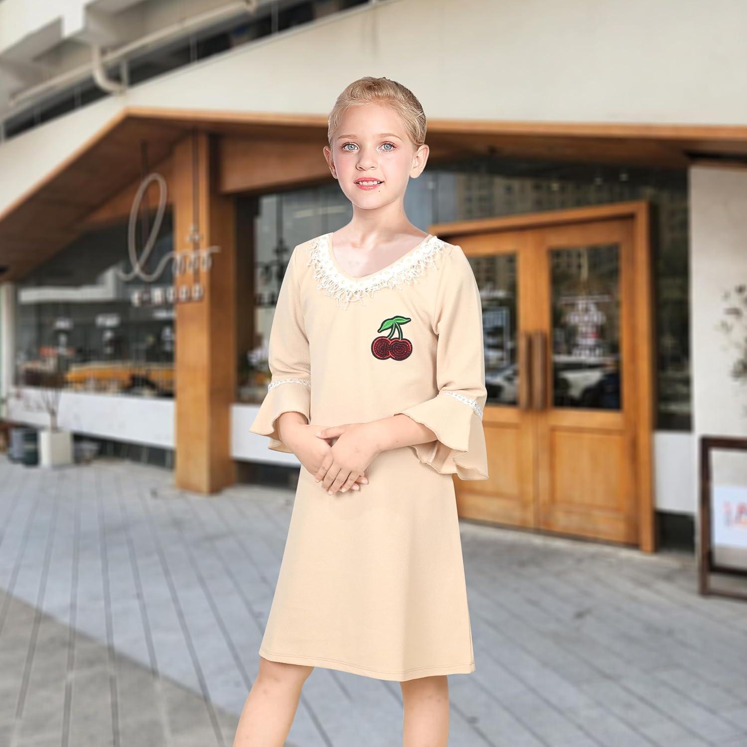 Sunny Fashion Girls Dress Lace Trim Bell Sleeve Cherry Applique Pearl A-Line Casual Size 3-8(Pinkish Yellow)