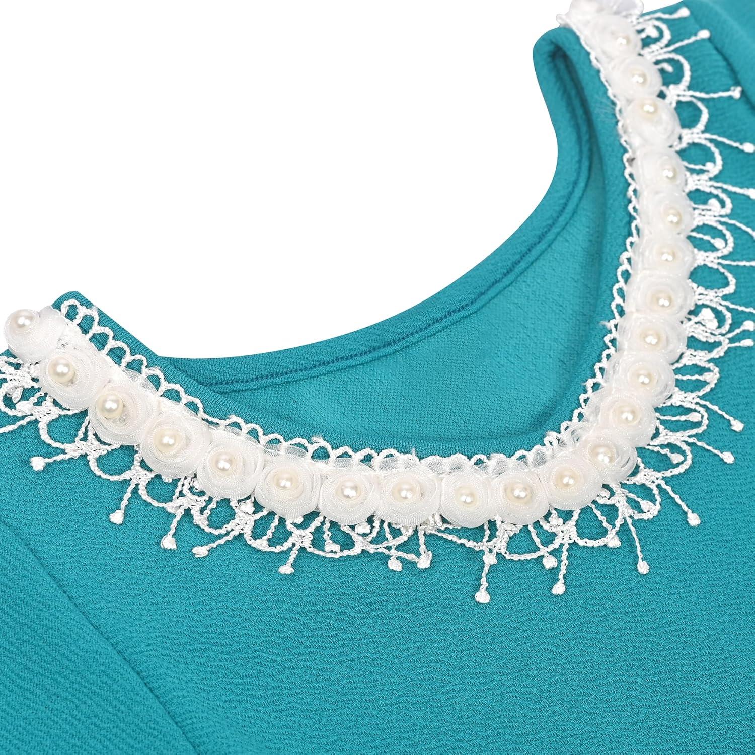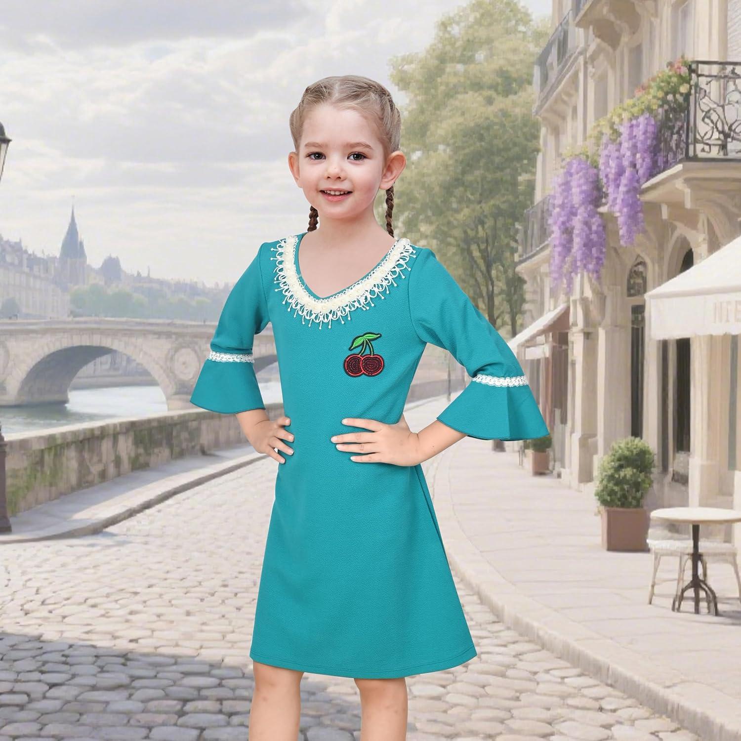 Sunny Fashion Girls Dress Lace Trim Bell Sleeve Cherry Applique Pearl A-Line Casual Size 3-8(Pale Green)