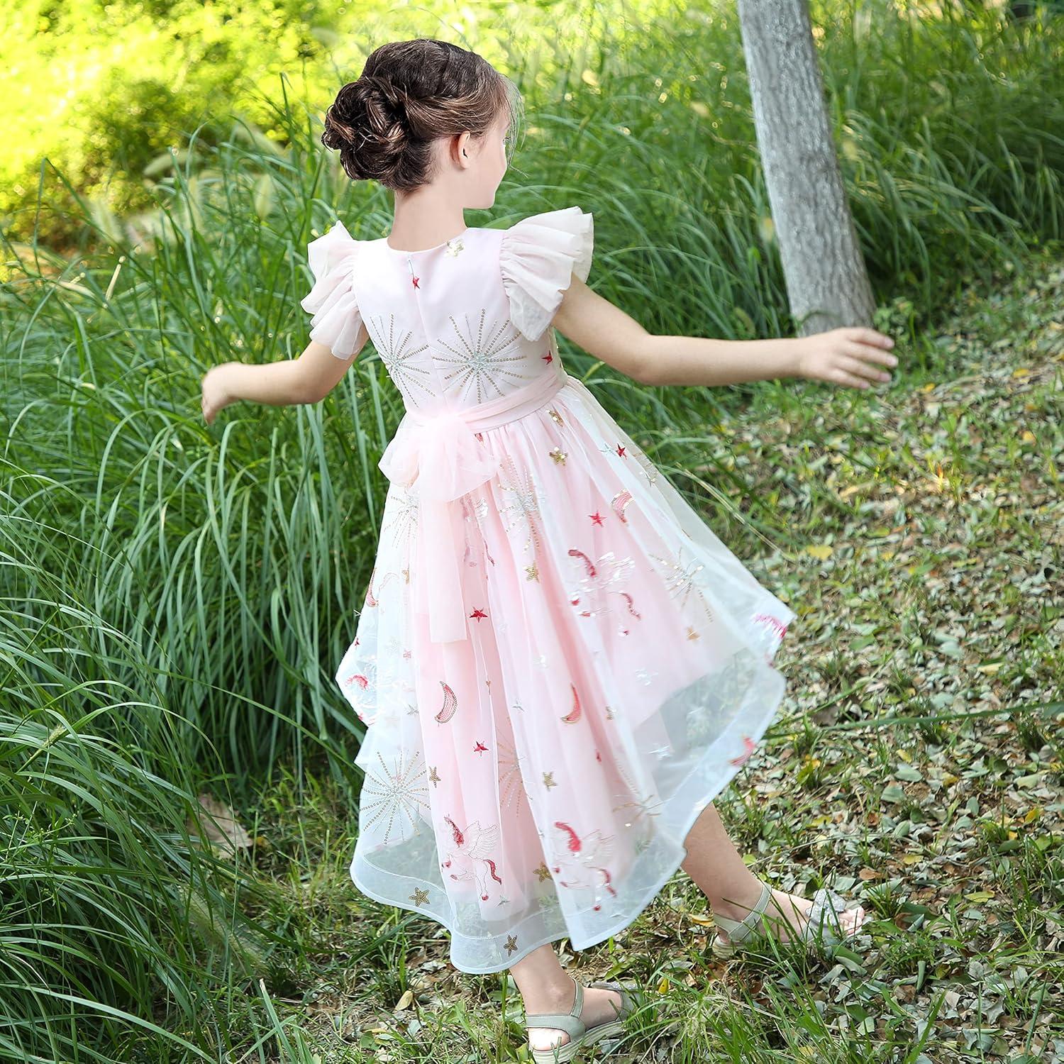 Sunny Fashion Girl Dress Pink Tulle Sequin Unicorn Star Moon Party Ruffle(Pink)