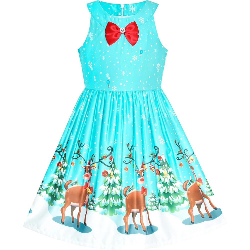 Sunny Fashion Girls Dress Christmas Eve Christmas Tree Snow Reindeer Party(Blue Reindeer)
