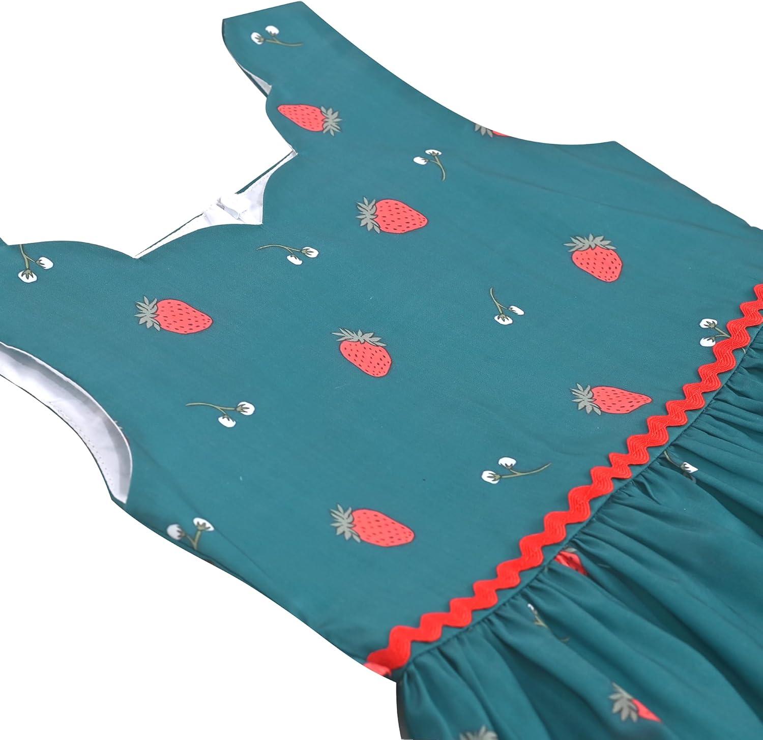 This girl's dress features a vibrant green color with a unique neckline. It has an all-over print of strawberries and flowers, creating a playful and cheerful look. A zigzag ribbon accents the waist, adding a distinct detail. The dress is sleeveless, making it suitable for warmer weather. Ideal for casual daily wear, it can be worn at picnics, birthday parties, family gatherings, summer outings or playdates.