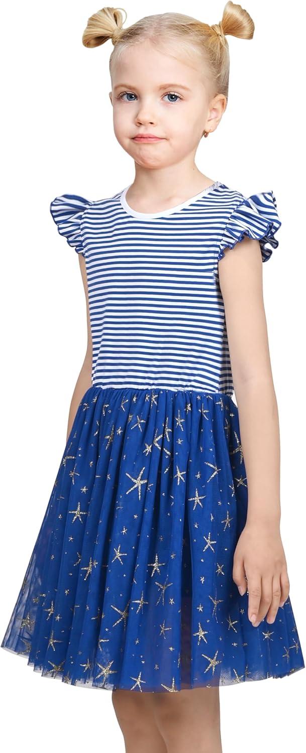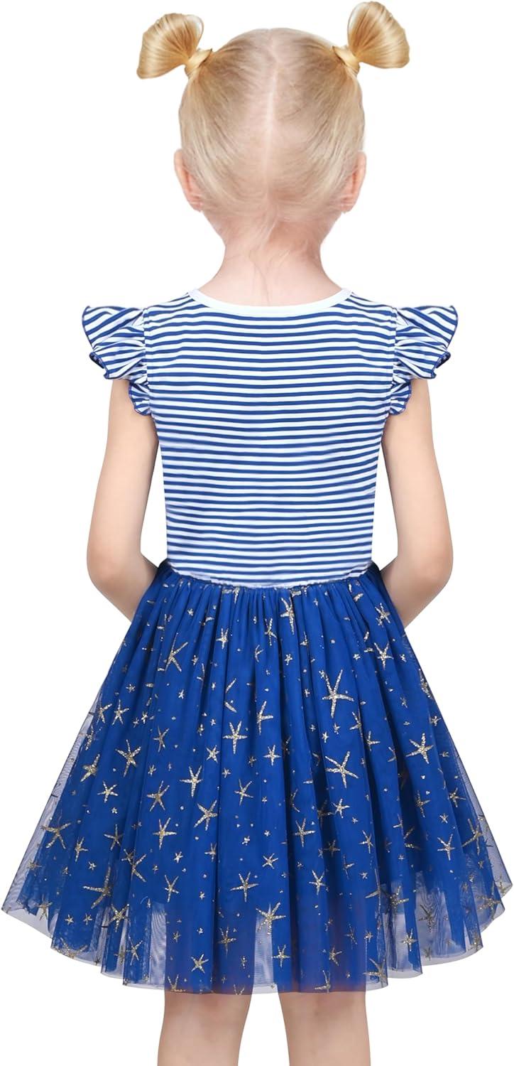 - Sunny Fashion Girls Dress Purple Short Sleeve Rainbow Tulle Skirt Birthday Party(Blue Striped)