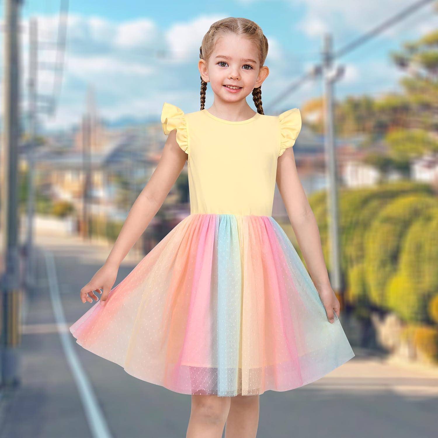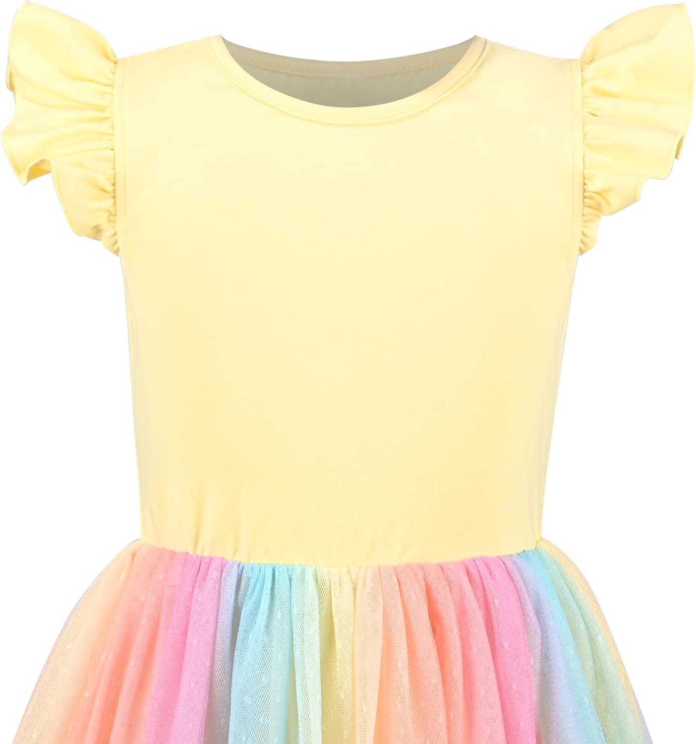- Sunny Fashion Girls Dress Purple Short Sleeve Rainbow Tulle Skirt Birthday Party(Yellow Rainbow)