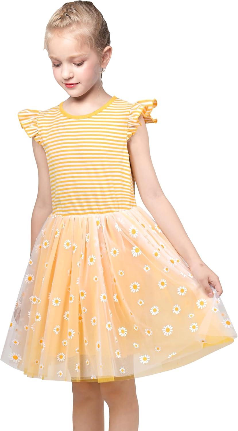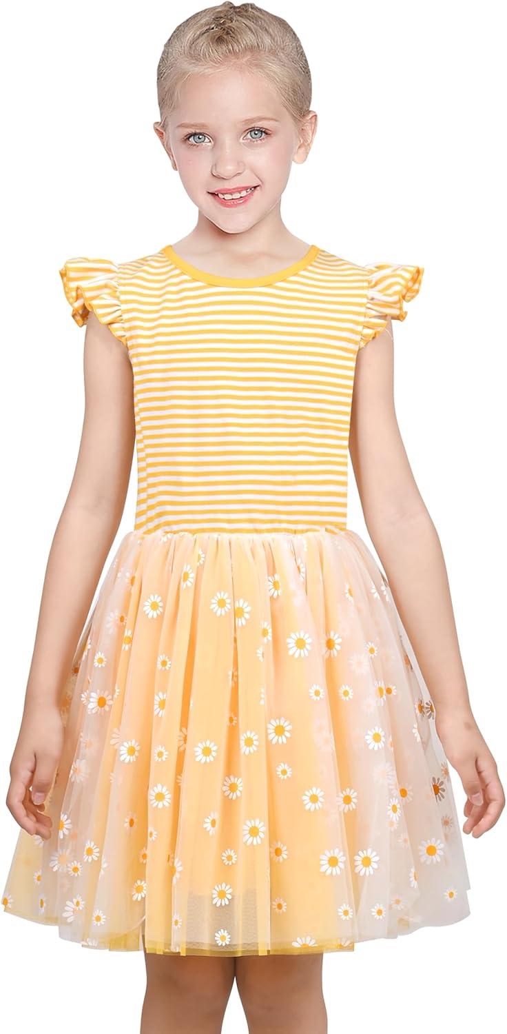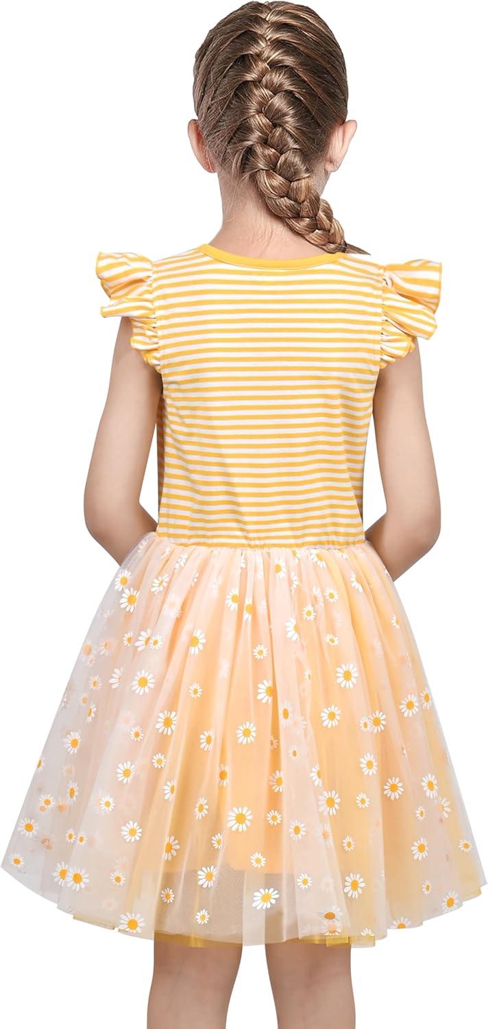 - Sunny Fashion Girls Dress Purple Short Sleeve Rainbow Tulle Skirt Birthday Party(Yellow Striped)